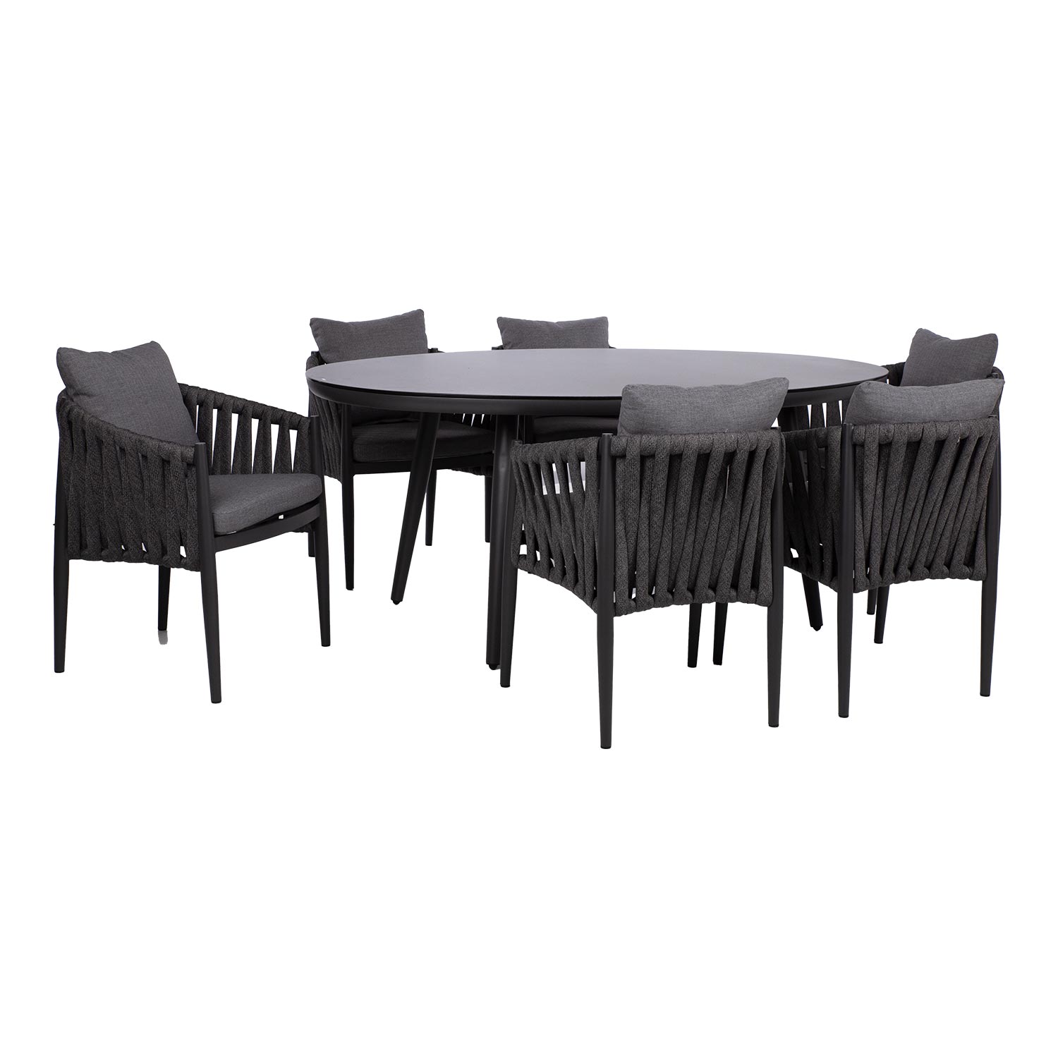Aiamööblikomplekt BRISTOL laud ja 6 tooli. Laua mõõdud: 180 x 120 x H74 cm. Lauaplaat: 5mm 3D prinditud karastatud klaas. Laua ja toolide jalad ja raam on valmistatud alumiiniumist ja viimistletud pulbervärviga. Tooli seljatugi ja küljed on kaetud efektse laia nöörpunutisega. Padjad kuuluvad komplekti. Istmepõhi on toestatud alumiiniumliistudega. Tooli üldmõõdud: 63 x 62 x H73 cm. Istmekõrgus 41/49 cm. Istmepadi 50/42 x 50 x H8 cm, seljatoepadi 42 x 40 cm. Padjakatted on valmistatud polüesterkangast. Padjakatted on eemaldatavad ja pestavad. Kaalupiirang: 110 kg. Toode on muutlikes ilmastikutingimustes vastupidav ja lihtsalt hooldatav. HOIUSTAMINE: suvehooaja lõppedes soovitame aiamööblit hoiustada siseruumides. Puhastage ja kuivatage mööbel enne hoiule panekut. Kasutage hoiustamiseks kuiva ning hea ventilatsiooniga ruumi.