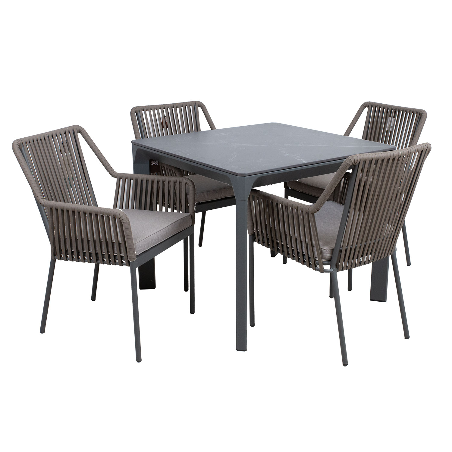 Aiamööblikomplekt CARVES laud ja 4 tooli. Laud CARVES ühendab endas minimalistliku disaini ja uudse tehnoloogia. Paagutatud kivist (sintered stone) lauaplaadi valmistamisel on kasutatud innovatiivset tehnoloogiat, mis jäljendab loodusliku kivi moodustumise protsessi sügaval maakoores. Kaoliini ehk portselansavi osakesed töödeldakse 1200 kraadises kuumuses, mille tulemusena moodustub materjal, mis oma omadustel ja välimuselt sarnaneb naturaalse kiviga. Lauaplaat on küll õhuke, kuid väga tugev (suhteline kõvadus Mohsi skaalal 7), kulumiskindel, talub hästi kõrget temperatuuri ja erinevaid ilmastikutingimusi, ei ima plekke ja seda on väga lihtne puhastada ja hooldada. Kuna keemilisi sideaineid ei ole kasutatud on materjal hügieeniline. TÄHELEPANU! Vältige lööke, põrutusi ja kukkumist. Laua mõõdud on 90x90xH75cm, lauaplaadi paksus 11mm. Laua ja toolide jalad ja raam on valmistatud alumiiniumist ja viimistletud halli pulbervärviga. Tooli selja- ja käetoed on kaetud textilene nöörist punutisega. Istmepadjad kuuluvad komplekti. Padjakatted on valmistatud polüesterkangast. Padja paksus 5cm. Istmepõhi on toestatud on alumiiniumliistudega. Tooli mõõdud on 56x57xH85cm, istmekõrgus 44cm. Kaalupiirang 100kg. Toolid on virnastatavad ning nende hoiustamine on lihtne ja ruumi säästev. Toode on muutlikes ilmastikutingimustes vastupidav ja lihtsalt hooldatav. Välitingimustes kasutatava mööbli eluea pikendamiseks soovitame kasutada välimööbli katteid. HOIUSTAMINE: suvehooaja lõppedes soovitame aiamööblit hoiustada siseruumides. Puhastage ja kuivatage mööbel enne hoiule panekut. Kasutage hoiustamiseks kuiva ning hea ventilatsiooniga ruumi.