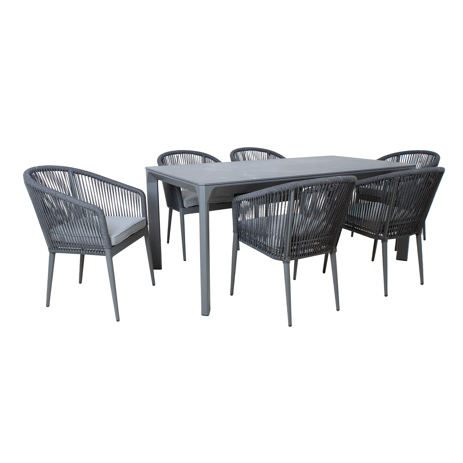 Aiamööblikomplekt CARVES laud ja 6 tooli. Laua mõõdud on 180x90xH75cm, lauaplaadi paksud 11mm. Jalad ja raam on valmistatud alumiiniumist (48x25x1,2mm) ja viimistletud halli pulbervärviga. Paagutatud kivist (sintered stone) lauaplaadi valmistamisel on kasutatud innovatiivset tehnoloogiat, mis jäljendab loodusliku kivi moodustumise protsessi sügaval maakoores. Kaoliini ehk portselansavi osakesed töödeldakse 1200 kraadises kuumuses, mille tulemusena moodustub materjal, mis oma omadustel ja välimuselt sarnaneb naturaalse kiviga. Lauaplaat on küll õhuke, kuid väga tugev (suhteline kõvadus Mohsi skaalal 7), kulumiskindel, talub hästi kõrget temperatuuri ja erinevaid ilmastikutingimusi, ei ima plekke ja seda on väga lihtne puhastada ja hooldada. Kuna keemilisi sideaineid ei ole kasutatud on materjal hügieeniline. TÄHELEPANU! Vältige lööke, põrutusi ja kukkumist. Tooli raam ja jalad on valmistatud alumiiniumist ja viimistletud halli pulbervärviga. Tooli selja- ja käetoed on kaetud nöörpunutisega. Istmepadi kuulub komplekti. Padjakate on valmistatud polüesterkangast. Padja mõõdud 45x42x5cm. Istmepõhi on toestatud alumiiniumliistudega. Tooli mõõdud on 57x65xH81cm, istmekõrgus 44cm. Kaalupiirang 100kg. Toolid on virnastatavad ning nende hoiustamine on lihtne ja ruumi säästev. HOIUSTAMINE: suvehooaja lõppedes soovitame aiamööblit hoiustada siseruumides. Puhastage ja kuivatage mööbel enne hoiule panekut. Kasutage hoiustamiseks jahedat, kuiva ning hea ventilatsiooniga.