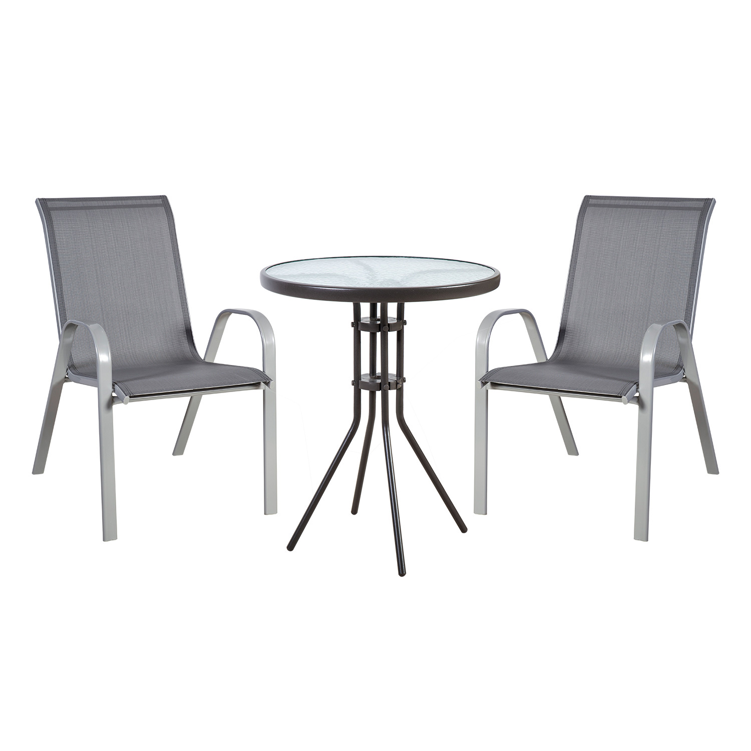Aiamööblikomplekt DUBLIN laud ja 2 tooli, hall. Laua mõõdud: D60 x H70 cm. Lauaplaat: 5 mm läbipaistev laineline klaas. Laua raam ja jalad on valmistatud terasest ja viimistletud tumepruuni pulbervärviga. Tooli textilene iste laseb hästi õhku läbi, kuivab kiiresti ja seda on lihtne puhastada. Tooli raam ja jalad on valmistatud terasest ja viimistletud halli pulbervärviga. Toolid on virnastatavad ning nende hoiustamine on lihtne ja ruumi säästev. Tooli üldmõõdud: 55,5 x 73 x H90 cm. Istme laius 45 cm, istme sügavus 41 cm, istme kõrgus 44 cm. Seljatoe kõrgus 57 cm. Käetoe kõrgus maast 61 cm. Kaalupiirang: 100 kg.