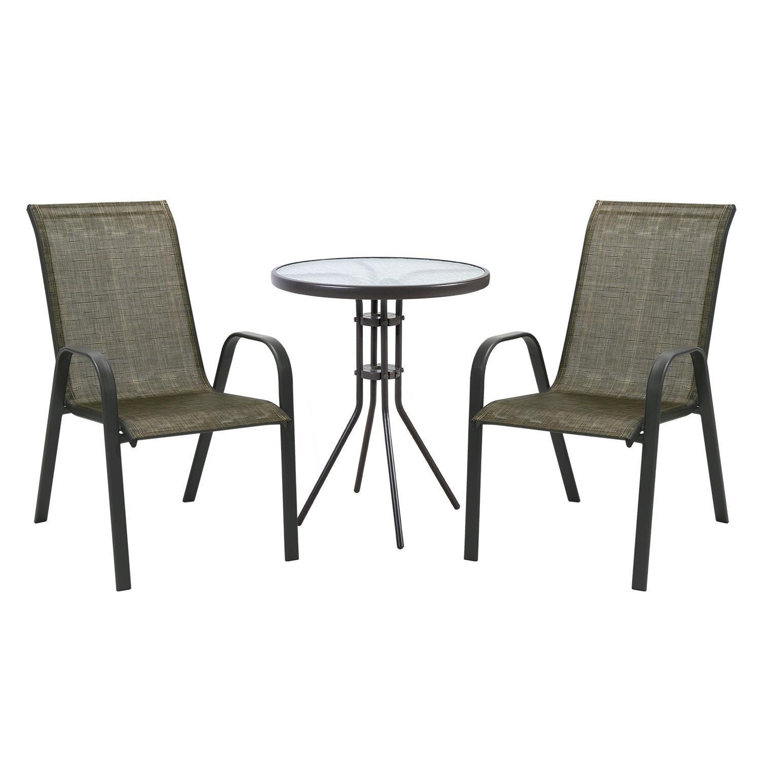 Aiamööblikomplekt DUBLIN laud ja 2 tooli, kuldpruun. Laua mõõdud: D60 x H70 cm. Lauaplaat: 5 mm läbipaistev laineline klaas. Laua ja toolide raam ja jalad on valmistatud terasest ja viimistletud tumepruuni pulbervärviga. Tooli textilene iste laseb hästi õhku läbi, kuivab kiiresti ja seda on lihtne puhastada. Toolid on virnastatavad ning nende hoiustamine on lihtne ja ruumi säästev. Tooli üldmõõdud: 55,5 x 73 x H90 cm. Istme laius 45 cm, istme sügavus 41 cm, istme kõrgus 44 cm. Seljatoe kõrgus 57 cm. Käetoe kõrgus maast 61 cm. Kaalupiirang: 100 kg.