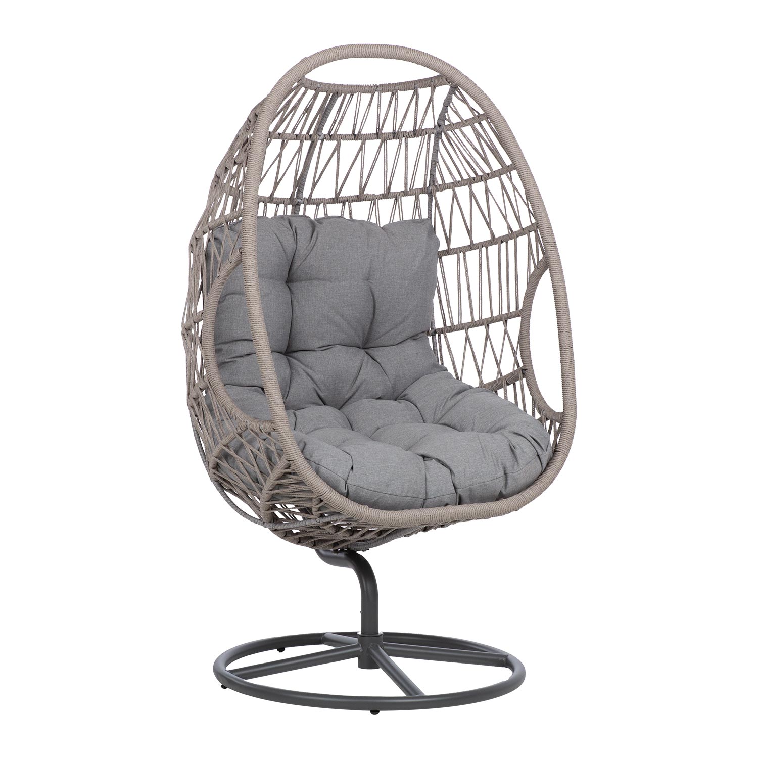 Puhketool CASSIA pöörlev, hall. Toolijalg on valmistud terasest ja viimistletud halli pulbervärviga. Terasest istmeraam on kaetud halli nöörpunutisega. Iste pöörleb 360°. Hall padjakate on valmistatud vastupidavast ja hea ilmastikukindlusega polüesterkangast 230 g/m². Tooli üldmõõdud: 85 x 85 x H151 cm. Istme kõrgus raami ääreni 45 cm. Aluse läbimõõt 75 cm. Padja mõõdud: 68/82 x 110 cm, padja paksus 15 cm. Kaalupiirang: 150 kg. Toode on muutlikes ilmastikutingimustes vastupidav ja lihtsalt hooldatav. Kaitset ilmastikuolude eest vajavad ainult padjad. Välitingimustes kasutatava mööbli eluea pikendamiseks soovitame kasutada välimööbli katteid. HOIUSTAMINE: suvehooaja lõppedes soovitame aiamööblit hoiustada siseruumides. Puhastage ja kuivatage mööbel enne hoiule panekut. Kasutage hoiustamiseks kuiva ning hea ventilatsiooniga ruumi.