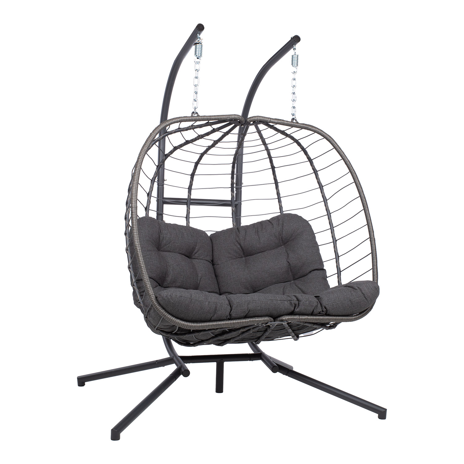 Ripptool FINSE 2-kohaline, tumehall. Muutke oma suvine elutuba lõõgastavaks oaasiks trendika ripptooliga! Mõnusalt kiikuv pehme padjaga korviste pakub meeldivalt varju ja on samas piisavalt avatud päikeselise suveilma nautimiseks. Ripptool sobib hästi ka siseruumides kasutamiseks. Ripptooli tugev terasest jalg on viimistletud tumehalli pulbervärviga. Korvistme terasest raam on kaetud tumehalli plastik- ja nöörpunutisega. Padjakatted on valmistatud hallist polüesterkangast. Ripptooli üldmõõdud: 142 x 106 x H194 cm. Korvistme mõõdud: 131,5 x 78 x H108,5 cm. Patjade mõõdud: 128 x 66 x 10 cm; 58 x 62 x 10 cm / 2 tk. Kaalupiirang: 240 kg. Toode on muutlikes ilmastikutingimustes vastupidav ja väga lihtsalt hooldatav. Kaitset ilmastikuolude eest vajavad ainult padjad. Välitingimustes kasutatava mööbli eluea pikendamiseks soovitame kasutada välimööbli katteid. HOIUSTAMINE: suvehooaja lõppedes soovitame aiamööblit hoiustada siseruumides. Puhastage ja kuivatage mööbel enne hoiule panekut. Kasutage hoiustamiseks kuiva ning hea ventilatsiooniga ruumi.