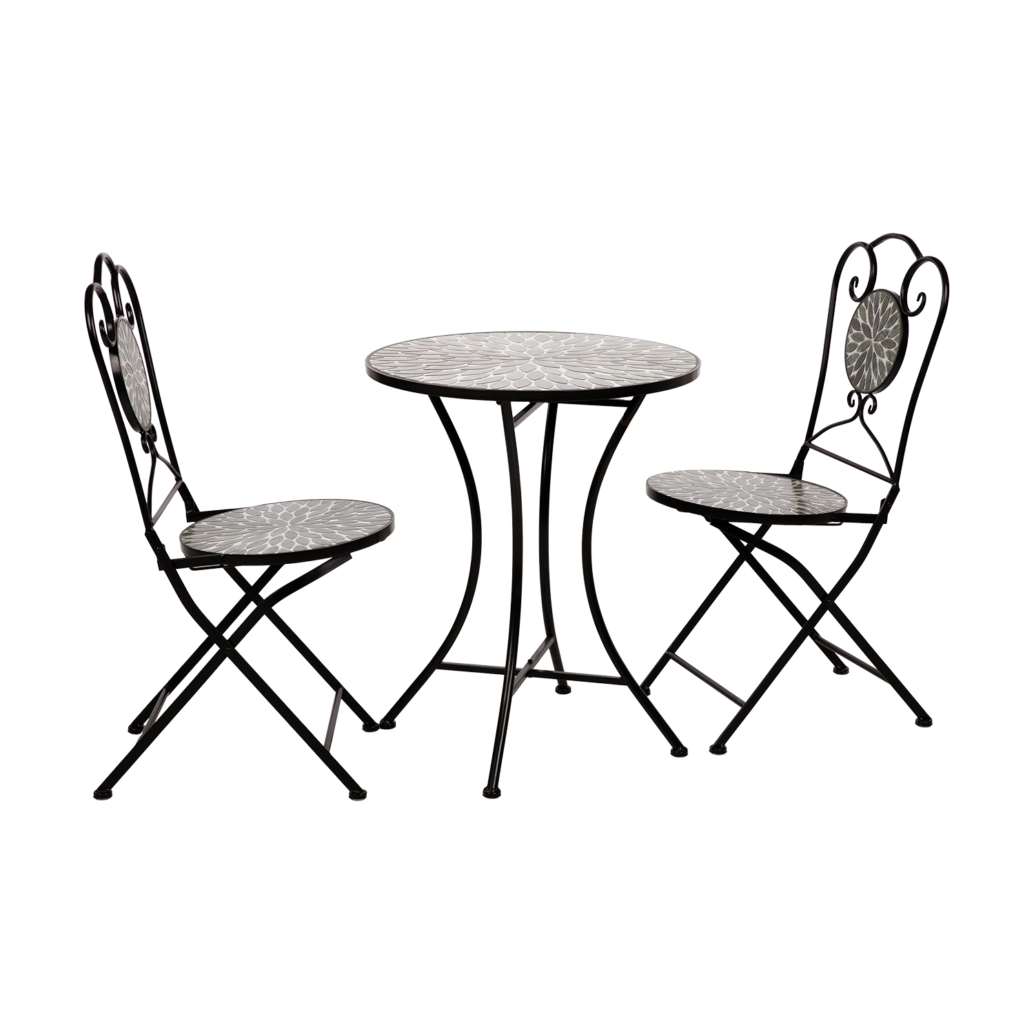 Rõdukomplekt MIRT laud ja 2 tooli, roheline. Lauaplaat ja kokkupandavate toolide iste ja seljatugi: roheliste lehemotiividega keramiline plaat. Laua ja toolide jalad ja raam on valmistatud metallist ja viimistletud musta pulbervärviga. Laua mõõdud on D60xH73cm. Tooli üldmõõdud on 40x51xH93cm. Istme läbimõõt 38cm, istme kõrgus 46cm. Tooli mõõdud kokkupanduna on 40x103x11cm. Kaalupiirang 90kg. HOOLDUS JA HOIUSTAMINE: metallist mööbel on praktiliselt hooldusvaba, piisab regulaarsest puhastamisest. Suvehooaja lõppedes soovitame aiamööblit hoiustada siseruumides. Puhastage ja kuivatage mööbel enne hoiule panekut. Kasutage hoiustamiseks kuiva ning hea ventilatsiooniga ruumi.