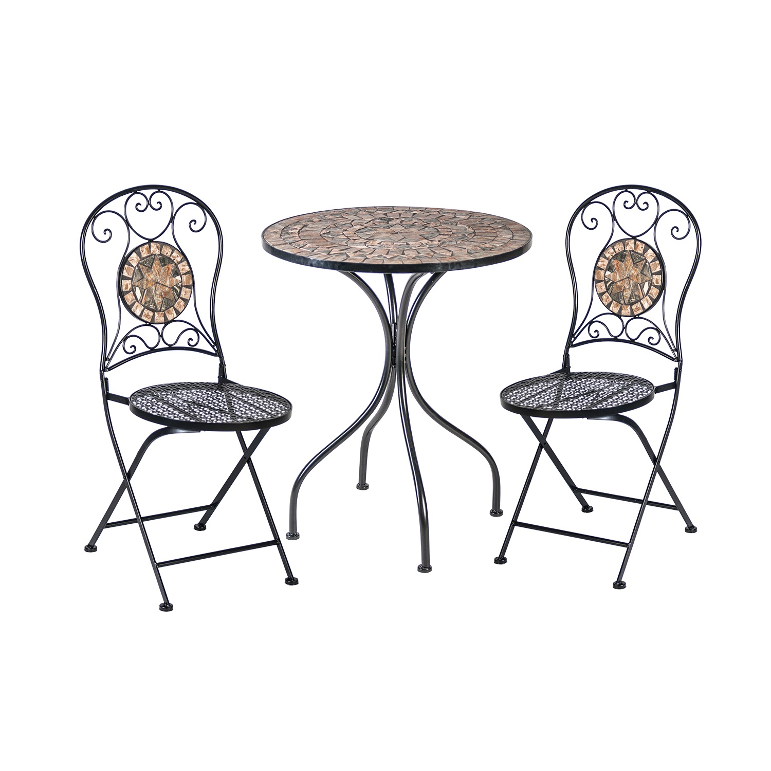 Rõdukomplekt MOSAIC laud ja 2 tooli. Laua mosaiikplaat ja kokkupandavate toolide seljatoed on kaunistatud pruunides ja hallides toonides keraamiliste plaatidega. Laua ja toolide jalad ja raam on valmistatud metallist ja viimistletud musta pulbervärviga. Laua mõõdud: D60 x H70 cm. Tooli üldmõõdud: 39 x 53 x H90 cm. Istme laius 37,5 cm, istme sügavus 38 cm, istme kõrgus 46 cm. Kaalupiirang: 90 kg. Tooli mõõdud kokkupanduna on 38 x 100 x 11 cm. HOOLDUS JA HOIUSTAMINE: Metallist mööbel on praktiliselt hooldusvaba, piisab regulaarsest puhastamisest. Suvehooaja lõppedes soovitame aiamööblit hoiustada siseruumides. Puhastage ja kuivatage mööbel enne hoiule panekut. Kasutage hoiustamiseks kuiva ning hea ventilatsiooniga ruumi.