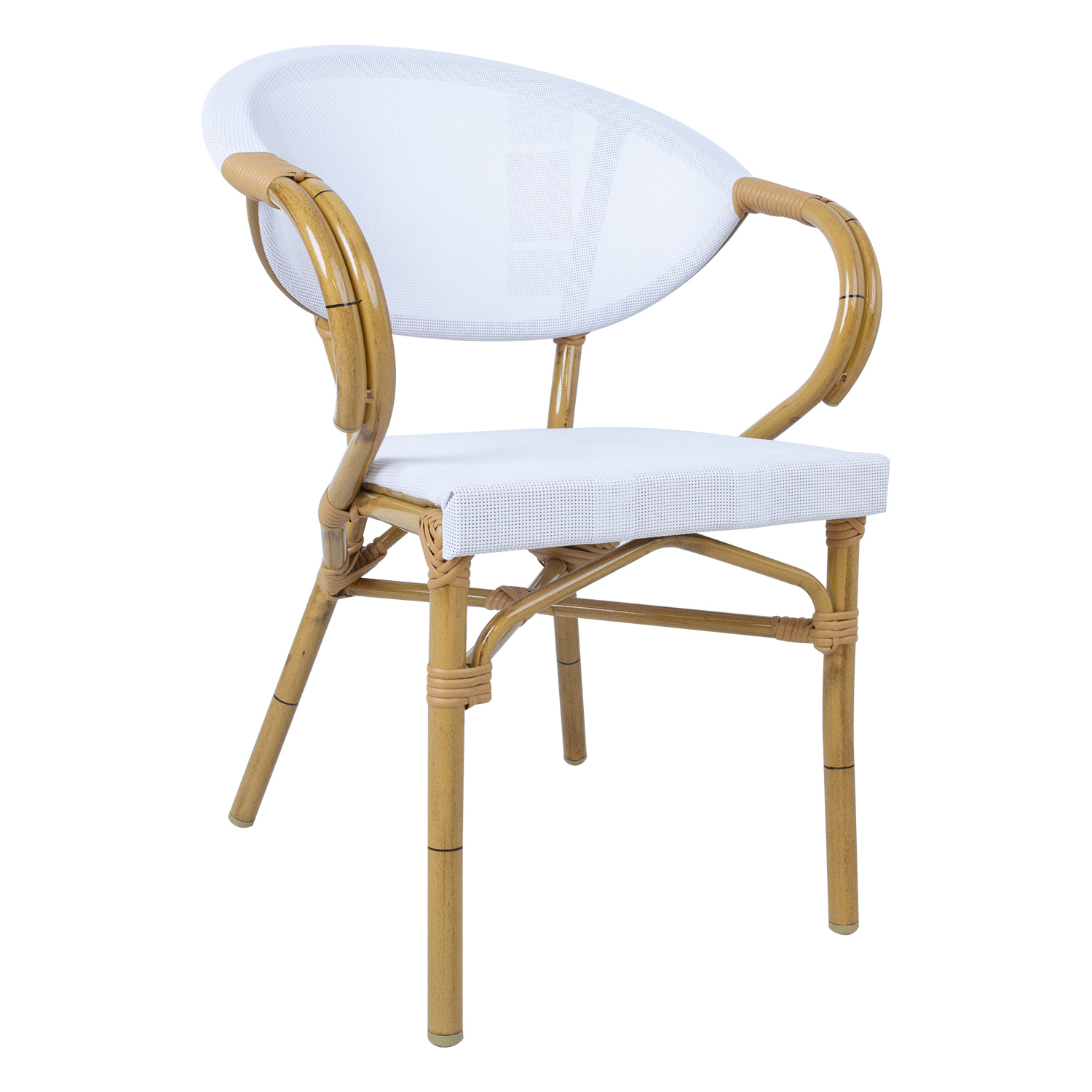 Tool BAMBUS käetugedega 57x58xH83cm, valge. Prantsuse bistroo stiilist inspireeritud mugav ja vastupidav tool on suurepärane valik koduaeda või kohvikusse. Tool sobib hästi ka siseruumides kasutamiseks. Tooli raam on valmistatud alumiiniumist ja viimistletud bambust meenutava bee˛i pulbervärviga. Alumiiniumtoru mõõdud on D28x1,5mm. Iste ja seljatugi on kaetud valge textilenega, mis laseb hästi õhku läbi ja kuivab kiiresti. Tooli üldmõõdud on 57x58xH83cm, istme laius 40cm, istme sügavus 41cm, istme kõrgus 44cm, seljatoe kõrgus 44cm. Kaalupiirang 120kg. Toolid on virnastatavavad ning nende hoiustamine on lihtne ja ruumisäästev. Toode on muutlikes ilmastikutingimustes hästi vastupidav ja lihtsalt hooldatav.