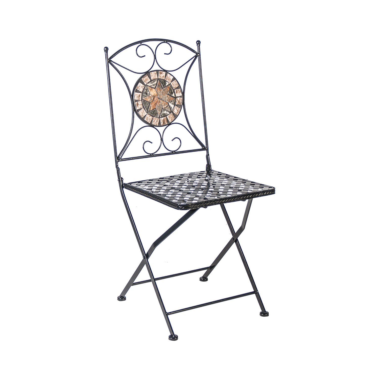 Tool MOSAIC kokkupandav. Tool on valmistatu metallist ja viimistletud musta pulbervärviga. Seljatuge kaunistab pruunides ja hallides toonides mosaiikplaat. Tool on kokkupandav. Tooli üldmõõdud: 39 x 53 x H90 cm. Istme laius 37,5 cm, istme sügavus 38 cm, istme kõrgus 46 cm. Kaalupiirang: 90 kg. Tooli mõõdud kokkupanduna on 38 x 100 x 11 cm.